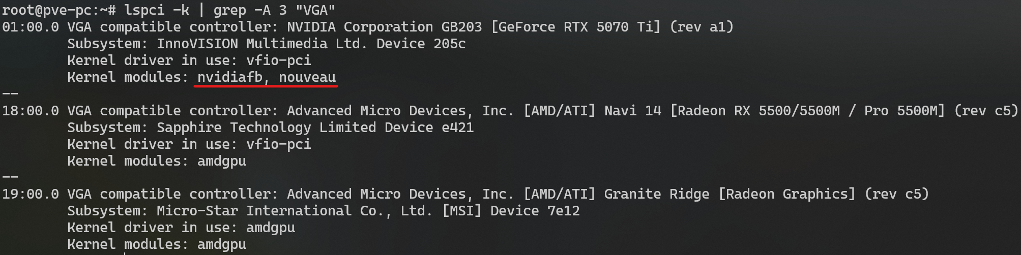 PS:因为我的电脑中已经配置好直通,所以`kernel driver in use:` 的值是 `vfio-pci`,这也是检测硬件是否成功屏蔽的方式