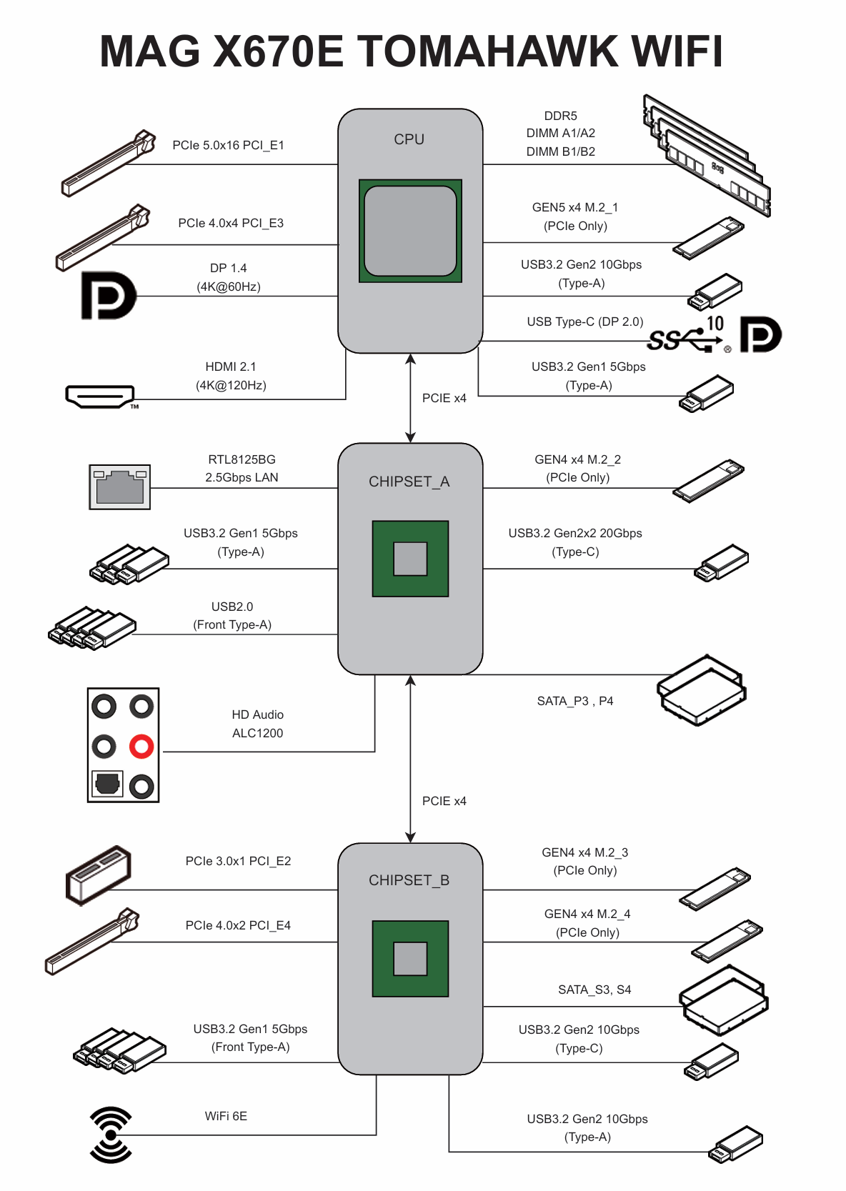 这次装机的惊喜主要是主板带给我的。对于虚拟机直通来说,首要考虑的是扩展性。这次选择的主板是 微星X670E战斧导弹,在同时插入两张双槽显卡的同时,还有两个PCIE扩展槽,并且没有任何冲突。而且用来插显卡的第1,3 pcie插槽都是CPU直出的。市面上能完美符合这种扩展性的主流主板真不多。