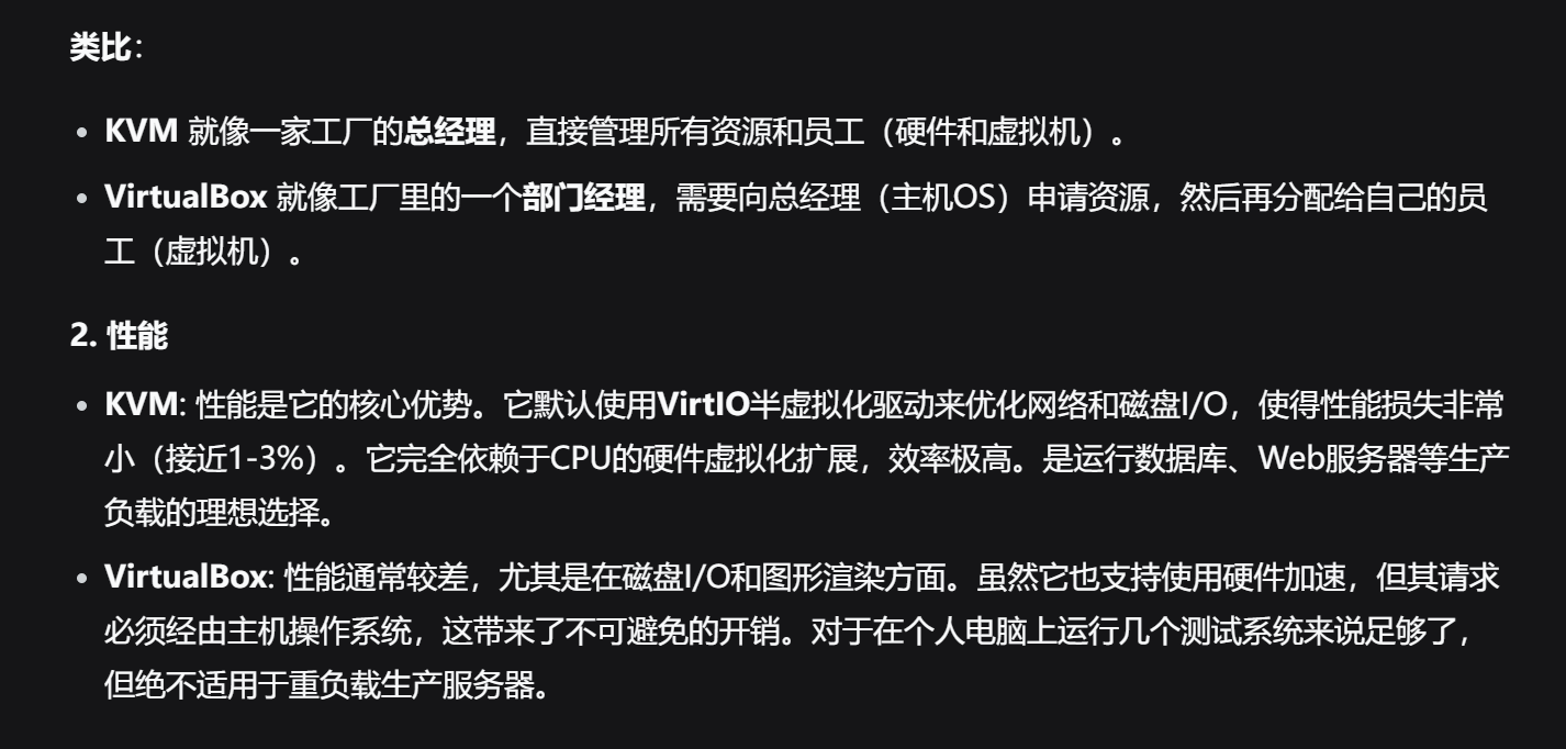 PVE是一个基于Debian的操作系统,是一套完善的虚拟机管理平台,以QEMU作为虚拟机管理工具,底层基于KVM(Kernel-based Virtual Machine:基于内核的虚拟机)虚拟化技术。以下是KVM与普通虚拟机(VirtualBox等)的区别: